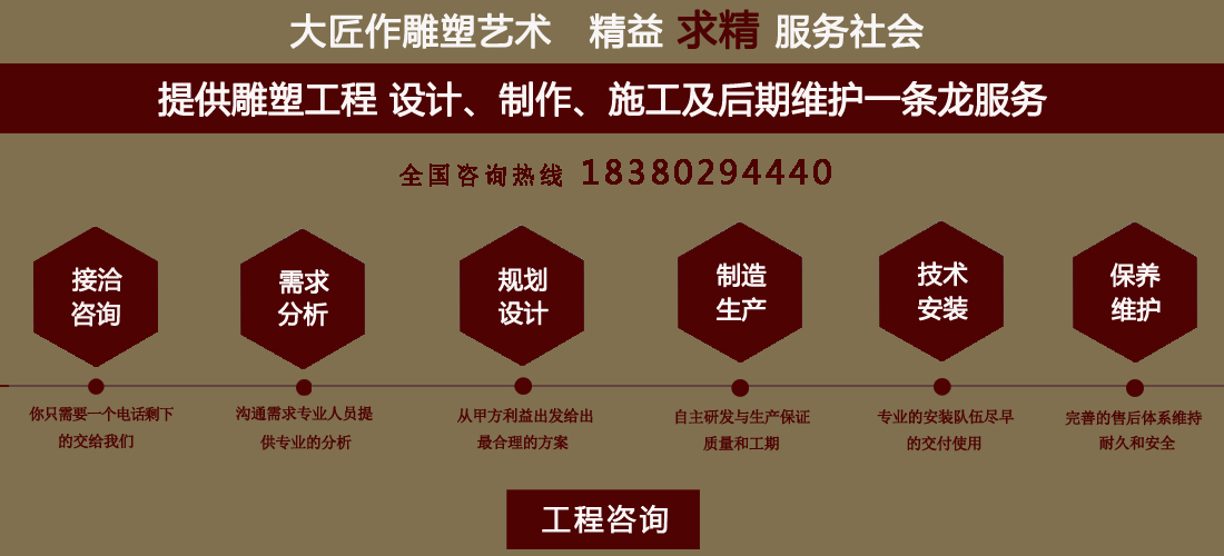 成都大匠作雕塑有限公司,是經(jīng)成都工商局審定注冊的正規(guī)專業(yè)雕塑制作及工程安裝服務(wù)機(jī)構(gòu),是由一群年輕富有朝氣的年輕人創(chuàng)辦,發(fā)軔于四川省成都市龍泉驛區(qū)。它是一家******于創(chuàng)作、制作和銷售為一體的公司。大匠作擁有多年從事公共藝術(shù)的專業(yè)人員和雕塑制作人組成的核心團(tuán)隊(duì),為您提供專業(yè)、具創(chuàng)新的設(shè)計及制作服務(wù)。公司成立以來,秉承“******服務(wù)、誠信為本”的宗旨,以客戶需求為目標(biāo)導(dǎo)向,不斷學(xué)習(xí),進(jìn)取,優(yōu)化和提高服務(wù)質(zhì)量,公司向您******——“您的滿意***是我們的信譽(yù)”,我們將以飽滿的熱情和******的服務(wù)贏得您的贊譽(yù)和支持。